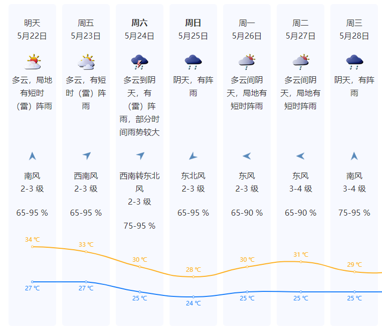 22日,清遠、韶關多雲,有(雷)陣雨局部大雨或暴雨,其餘市縣多雲,有分散(雷)陣雨。最高氣温:清遠、韶關29~31℃,其餘市縣31~35℃。