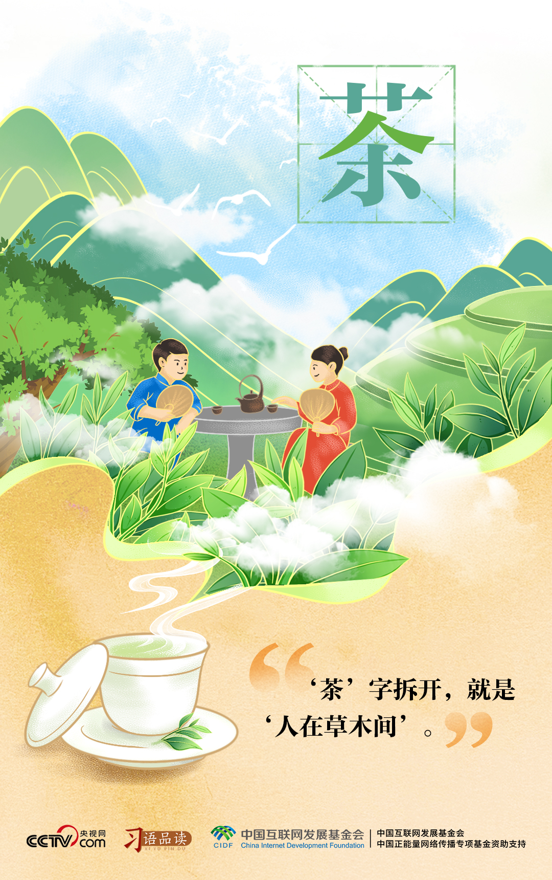 不同的交流場景,藴藏着相通的茶文化。總書記先將“茶”字拆解為“人在草木間”,形象描繪種茶、採茶、製茶和飲茶過程中人與自然和諧共生的畫面。之後,總書記又以“因茶致富”“因茶興業”闡釋茶的經濟價值和賦能千行百業發展的多元價值。
