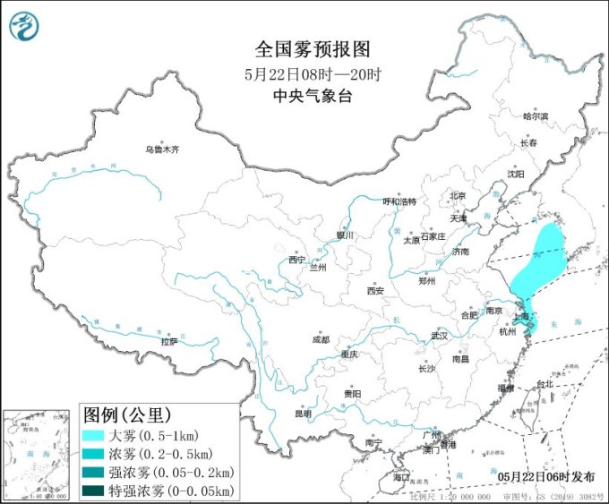 此外,今天白天,黃海中東部和南部海域、長江口及杭州灣附近海域、舟山羣島附近水域、上海港、寧波港將有能見度不足1公里的大霧。