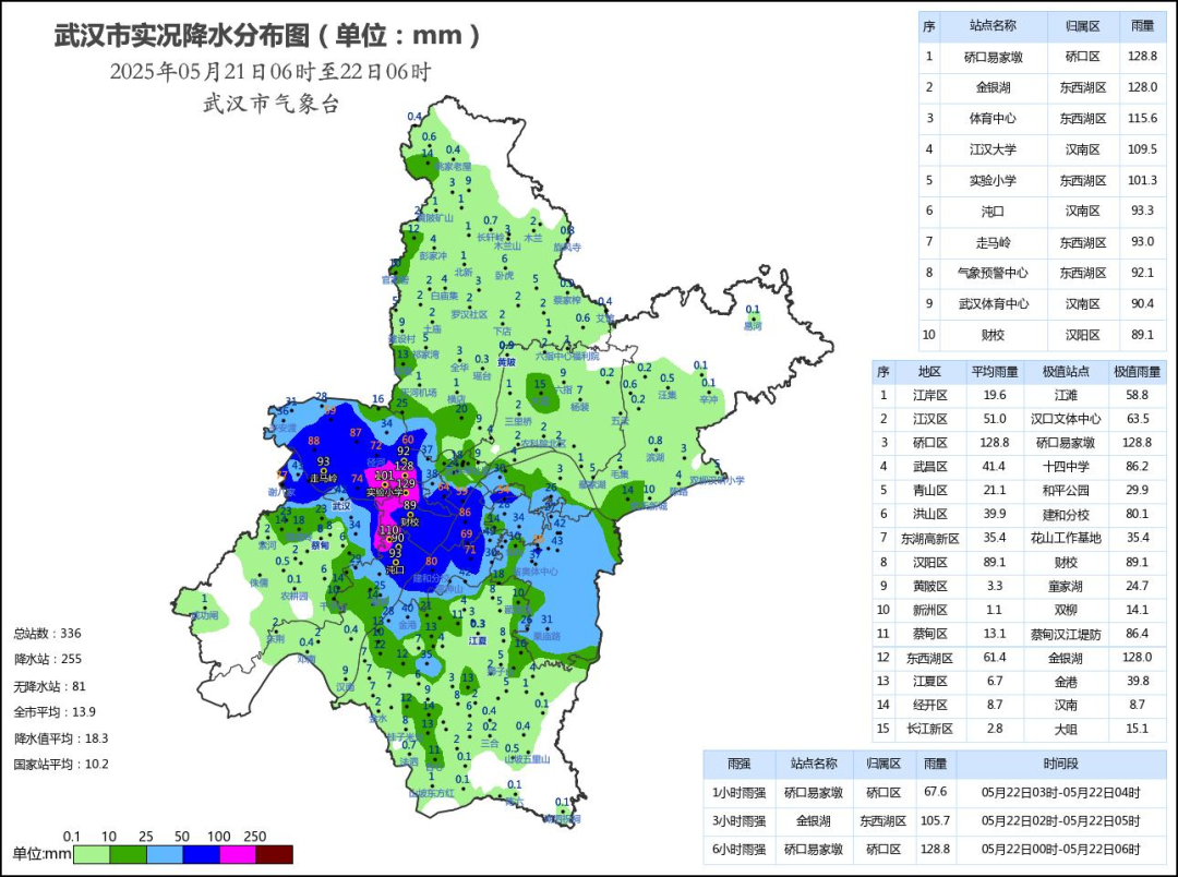 最大累計雨量和最大小時雨強均出現在礄口區易家墩站,分別為128.8毫米和67.6毫米(出現時間22日03時-04時)。