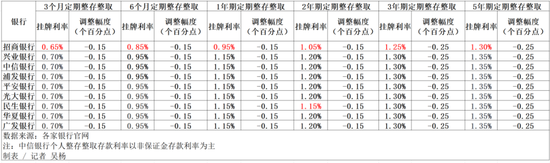 招商銀行整存整取1年期、2年期、3年期、5年期存款掛牌利率分別下調至0.95%、1.05%、1.25%、1.30%。其餘8家股份行整存整取1年期、2年期、3年期、5年期掛牌利率降至1.15%、1.2%(民生銀行為1.15%)、1.30%、1.35%。