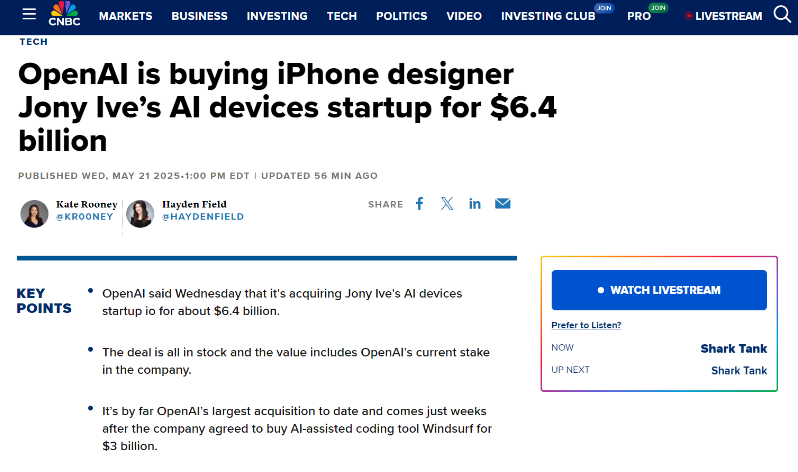 【環球網財經綜合報道】近日,OpenAI宣佈將以64億美元全資收購AI硬件初創公司io Products,據悉該初創公司由蘋果前首席設計官喬尼·艾夫創立,此項收購若順利進行,將是OpenAI迄今為止的最大規模收購,並藉此獲得一個專門開發人工智能驅動設備的部門。