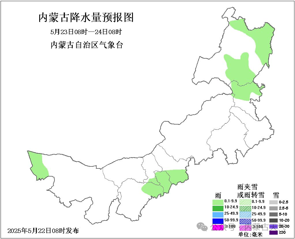 23日08時至24日08時,阿拉善盟西北部、鄂爾多斯市東北部、包頭市東南部、呼和浩特市、烏蘭察布市南部、興安盟北部、呼倫貝爾市南部和東部地區多雲,有小雨;西部偏東、中部偏西和東北部地區4、5級短時6、7級局地8級西北風。