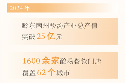 現在,酸湯正從家庭走向市場、從本土邁向世界。2024年,黔東南州酸湯產業總產值突破25億元,1600餘家酸湯餐飲門店覆蓋62個城市。