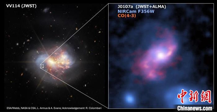 NASA韋布望遠鏡拍攝的近紅外圖像,顯示了附近星系VV114和背景中的巨型棒旋星系J0107a;右圖為J0107a的恆星和分子氣體分佈(圖片來自論文)。施普林格·自然 供圖