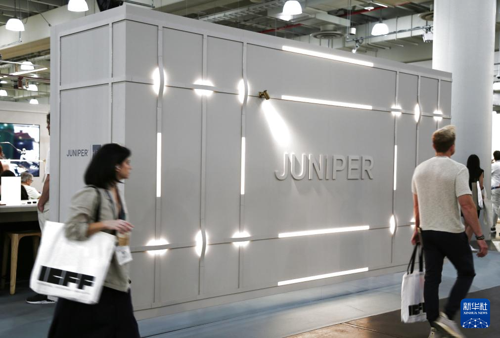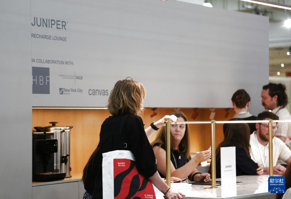 5月18日,在美國紐約舉行的2025年國際當代傢俱展現場,人們在美國燈飾設計和製造企業朱尼珀設計集團公司與美國北卡羅來納州家居和紡織品生產商HBF紡織品公司的展區參展。新華社記者 劉亞南 攝