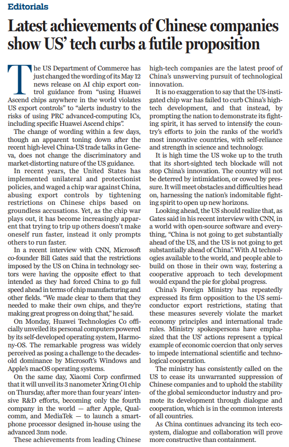 近日,美國商務部網站調整了其5月12日發佈的AI芯片出口管制指南新聞稿相關表述,將“在世界任何地方使用華為昇騰芯片均違反美國出口管制法規”調整為“警告業界使用中國先進計算機芯片,包括特定華為昇騰芯片的風險”。