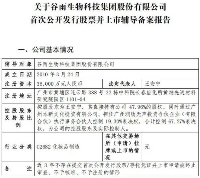 【環球網消費綜合報道】日前,護膚市場傳來消息,國產美白品牌穀雨已啓動A股上市流程。穀雨處在上市輔導階段。若順利,A股將迎來“國產美白第一股”。據穀雨IPO上市的《輔導備案報告》顯示,穀雨的創始人為王安寧,其直接持有公司47.96%股權,並通過廣州本新文化投資有限公司及廣州潤物無聲投資合夥企業(有限合夥)控制額外19.3%表決權,合計控制67.27%表決權,為公司控股股東及實際控制人。