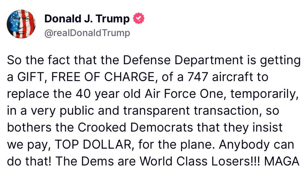 多名知情人士對美國有線電視新聞網記者説,特朗普政府首先與卡塔爾接洽,詢問是否可以獲得一架波音747飛機,用作總統專機。而按照特朗普本人的説法,卡塔爾主動提出把這架飛機作為“禮物”送給他。