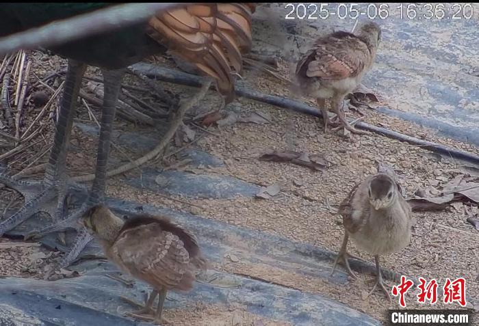 5月6日,3只綠孔雀雛鳥在覓食。鎮康南捧河省級自然保護區管護局供圖
