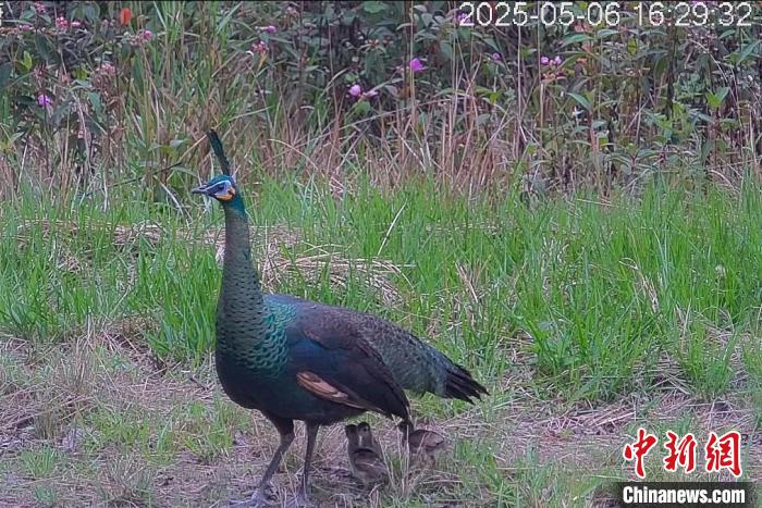葉祖建介紹,他們查看紅外相機時,發現其中1台於今年5月6日拍攝到1只雌性綠孔雀帶領3只雛鳥在林間覓食畫面,雛鳥絨毛未褪,推測出生僅一週左右。