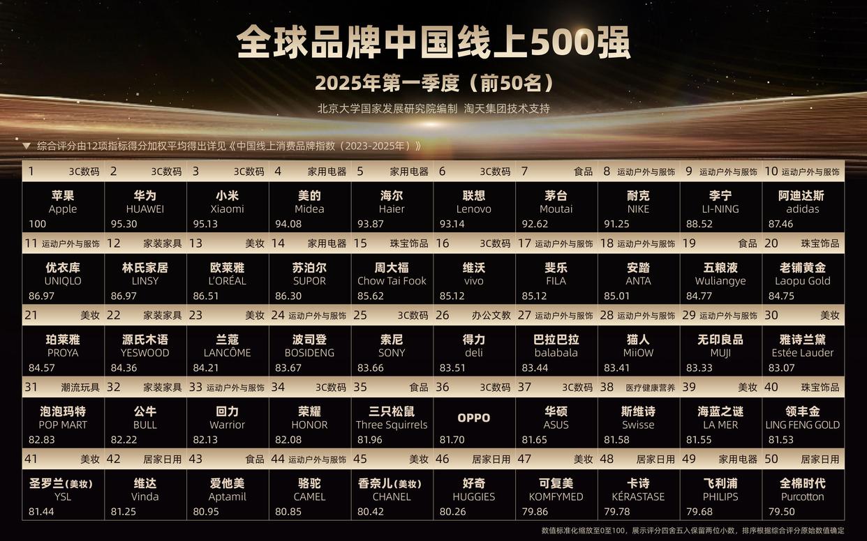 榜單顯示,綜合得分最高的前1000個品牌中,國際品牌佔比29.8%;前500品牌中,這一佔比進一步上升到31.2%;而在前100品牌中,國際品牌佔比更增至36%,反映出中國線上市場已經成為頭部國際品牌的必爭之地。