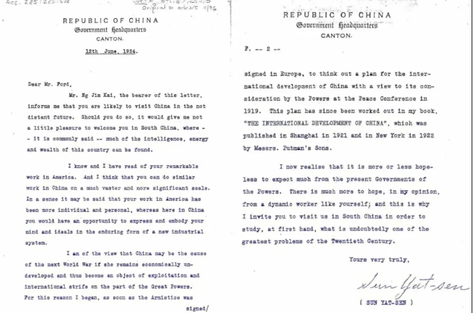 1924年,孫中山先生致信亨利·福特(Henry Ford),邀請其前往中國南方實地考察,希望藉助福特在工業化方面的經驗與實力,推動中國現代工業的發展,並提出“以更盛大的規模成就同樣的事業”的設想。