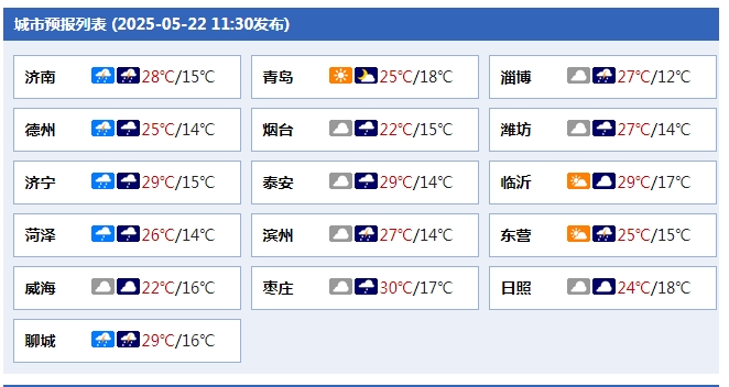 最低氣温:魯中山區和半島內陸地區11~13℃,其他地區14~16℃。最高氣温:濟南北部、淄博北部、濰坊和魯西北地區30~33℃,南部沿海地區20~23℃,其他地區26~29℃。