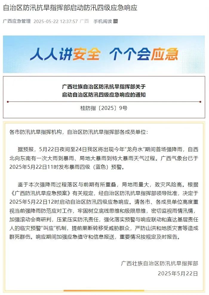 5月22日,自治區防汛抗旱指揮部下發通知,決定於2025年5月22日12時啓動自治區防汛四級應急響應。