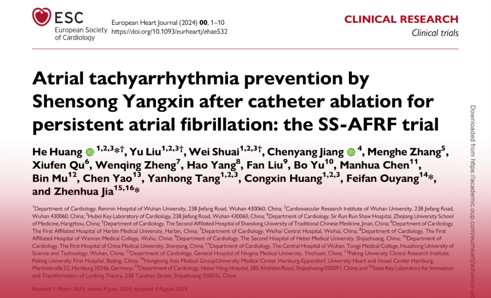 參松養心膠囊科研成果發表在國際醫學頂刊《歐洲心臟雜誌》