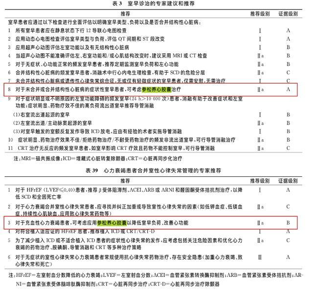 同時,對於充血性心力衰竭患者,可考慮應用參松養心膠囊以降低室早負荷,改善心功能(Ⅱa類推薦 B級證據)。