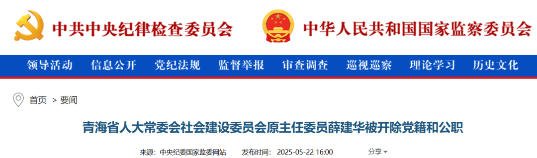據青海省紀委監委消息:經中共青海省委批准,青海省紀委監委對省人大常委會社會建設委員會原主任委員薛建華嚴重違紀違法問題進行了立案審查調查。