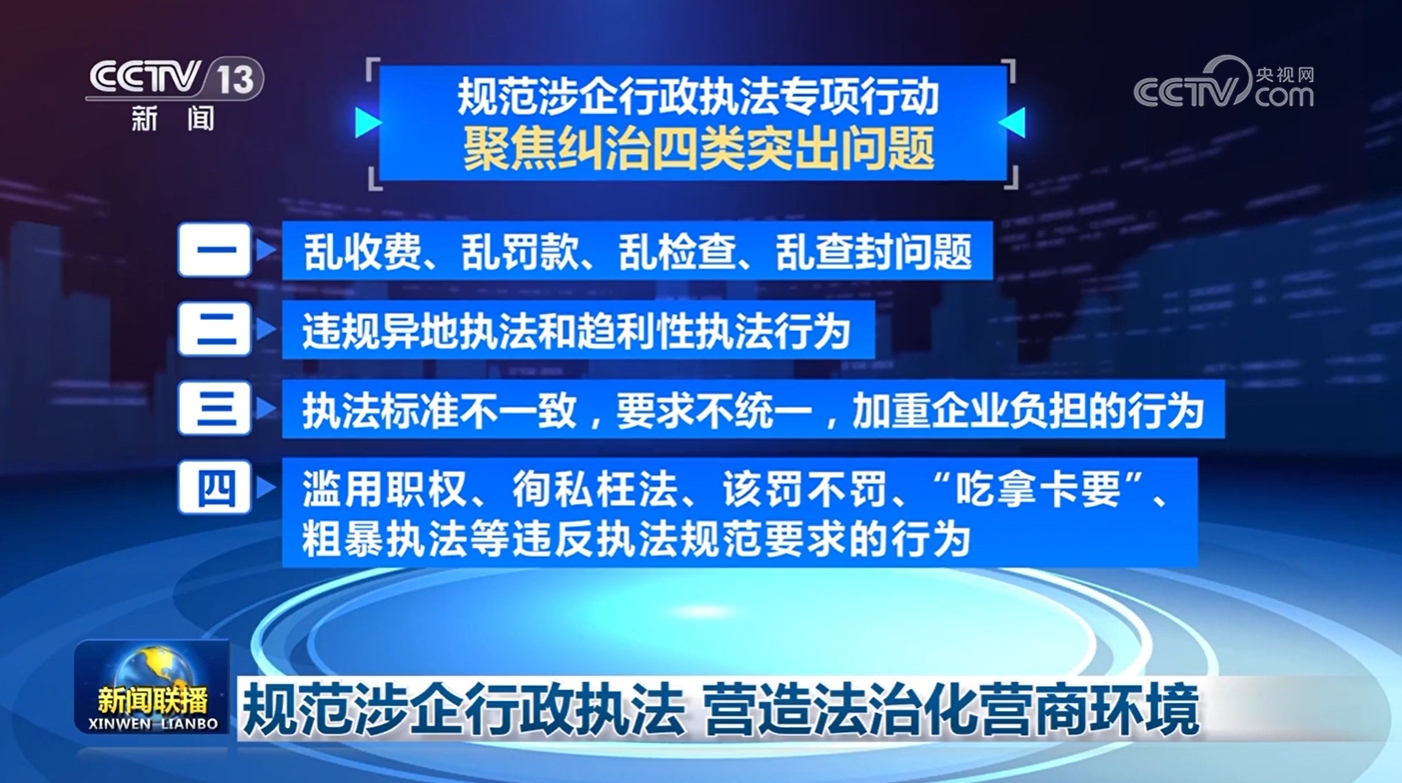 司法部介紹,規範涉企行政執法專項行動聚焦糾治四類突出問題:一是亂收費、亂罰款、亂檢查、亂查封問題;二是違規異地執法和趨利性執法行為;三是執法標準不一致,要求不統一,加重企業負擔的行為;四是濫用職權、徇私枉法、該罰不罰、“吃拿卡要”、粗暴執法等違反執法規範要求的行為。