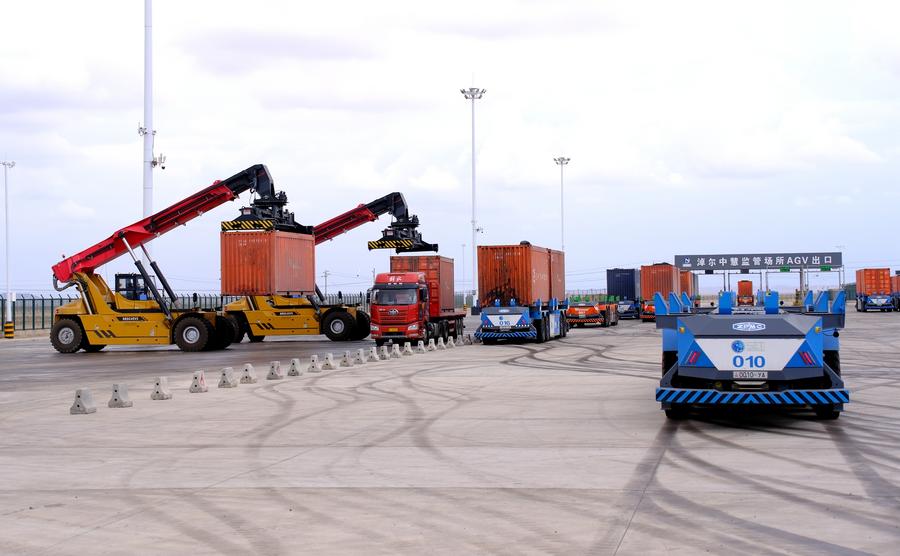 新華社呼和浩特5月21日電(記者李雲平)一輛輛滿載進口煤炭和銅精礦的貨車排隊入境,一台台運載集裝箱的AGV無人駕駛車輛往來穿梭,一座座建設國門的塔吊勾勒出邊境城鎮的天際線。