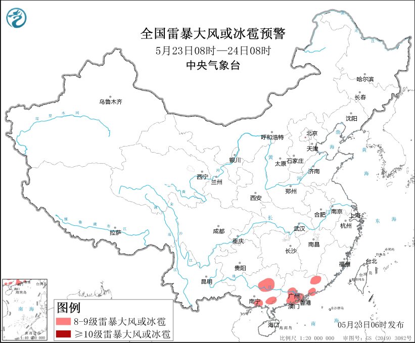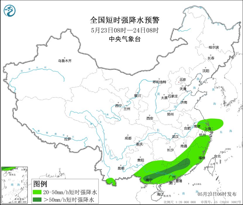 預計5月23日08時至24日08時,廣西中東部、廣東東部和南部等地的部分地區將有8級以上雷暴大風或冰雹天氣;江蘇南部、上海、浙江、福建、江西南部和東部、湖南南部、廣東、廣西、雲南西南部等地的部分地區將有小時雨量大於20毫米的短時強降水天氣,其中,江西南部、福建西南部、廣西南部和東部、廣東中北部等地的部分地區小時雨量大於50毫米,最大可達80毫米以上。
