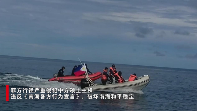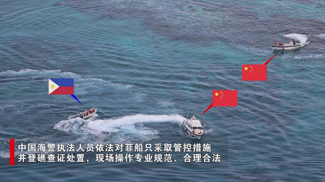 此次菲方的侵權行動中,菲方人員還曾搭載衝鋒艇非法登上鐵線礁活動,視頻顯示,中國海警執法人員依法對菲船隻採取管控措施,並登礁查證處置,用專業探測設備對鐵線礁進行檢查,現場操作專業規範、合理合法。