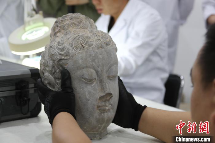 5月20日,河南洛陽,龍門石窟研究院工作人員展示已完成修復的唐代佛頭。中新社記者 闞力 攝