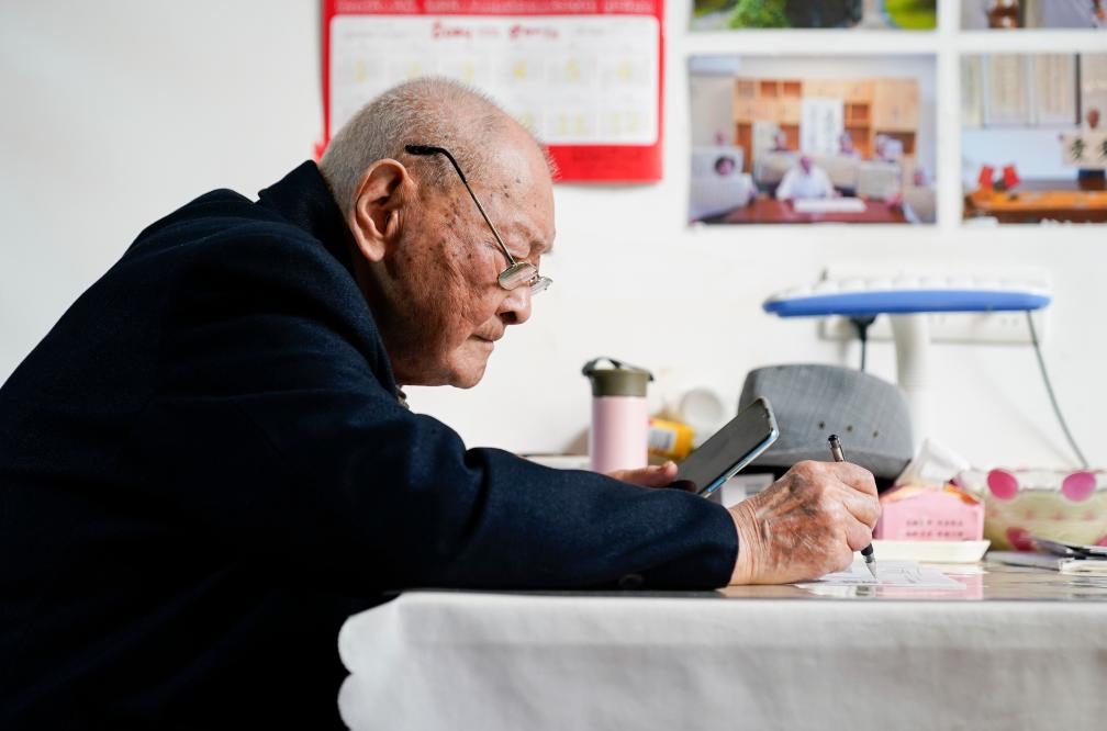 ↑在四川省南充市五福堂頤養院,劉壽山抄錄手機上的新聞信息(4月9日攝)。