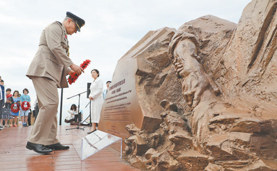 5月20日,在東極漁民營救英俘紀念碑揭幕活動現場,英國駐華大使館武官向紀念碑獻花。