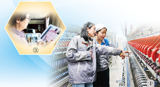 圖④:浙江理工大學高工趙連英(左)到企業指導混色打樣技術應用。