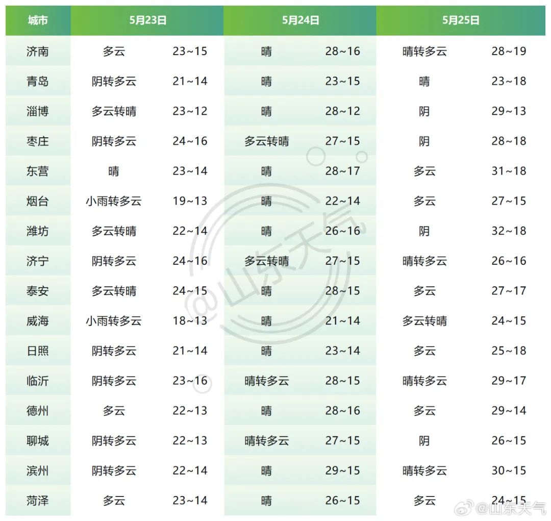 23日**白天到夜間,日照、濰坊和半島地區天氣陰有小雨轉晴,其他地區天氣多雲轉晴。北風4~5級陣風6~7級減弱到3~4級。