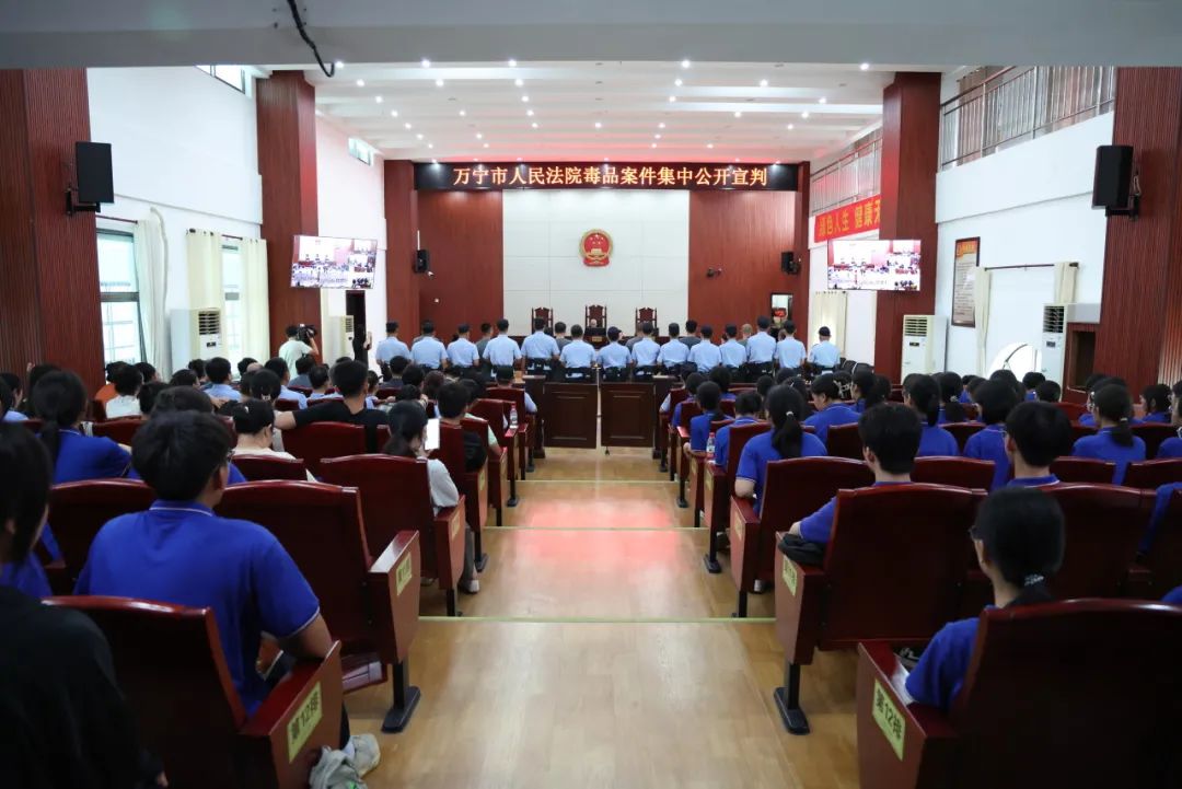 為依法打擊和懲治毒品犯罪,彰顯嚴打態勢,在國際禁毒日即將到來之際,5月22日上午,萬寧法院對2起7人毒品犯罪案件進行集中公開宣判,市人大代表、政協委員、檢察院、公安局、司法局、萬寧中學學生、媒體記者、家屬代表等近百人到場旁聽宣判。