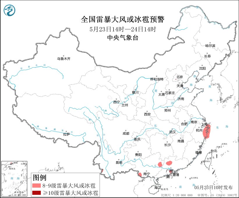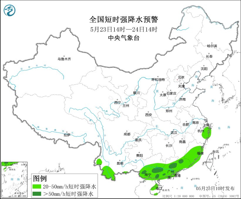 預計5月23日14時至24日14時,浙江東北部、廣西西南部和東北部、廣東北部和南部沿海等地的部分地區將有8級以上雷暴大風或冰雹天氣;華南、江南東部等地的部分地區將有小時雨量大於20毫米的短時強降水天氣,其中,廣西中南部、廣東中西部和東北部等地的部分地區小時雨量大於50毫米,最大可達80毫米以上。