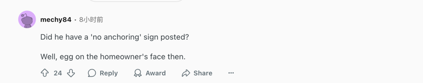 “他(房主)貼‘禁止拋錨’的標誌了嗎?好吧,這確實讓房主挺尷尬的。”