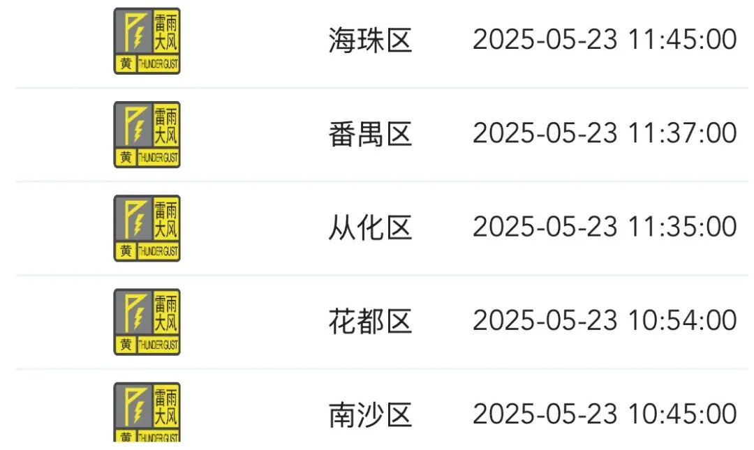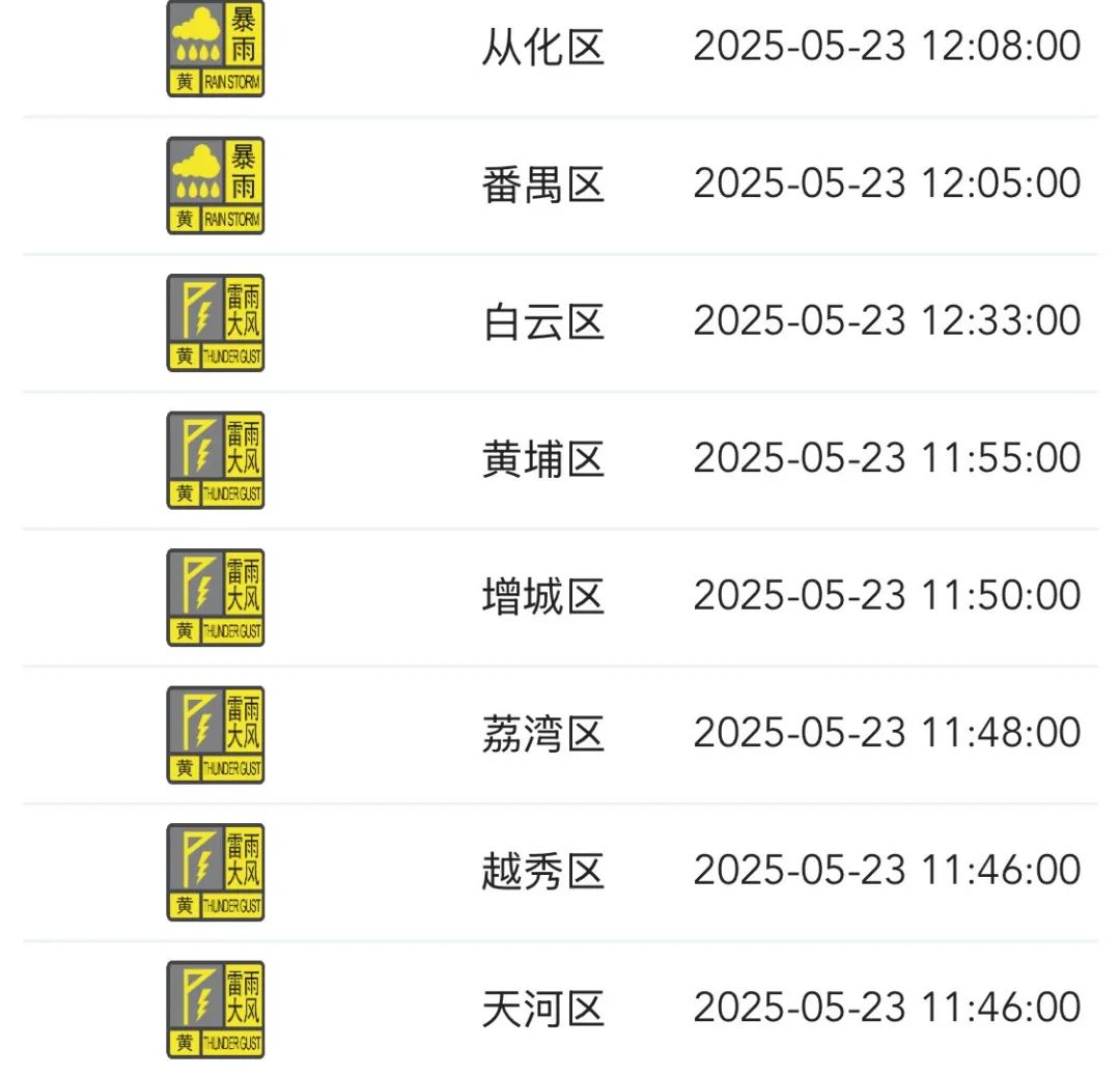 到5月23日12時35分,廣州市各區均發佈了雷雨大風黃色預警信號,番禺區、從化區發佈了暴雨黃色預警信號。