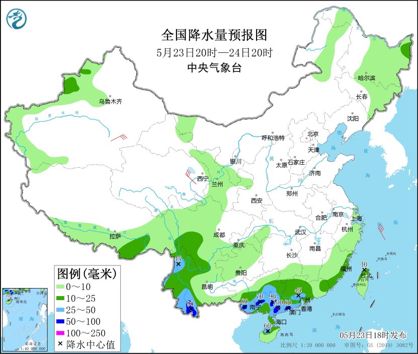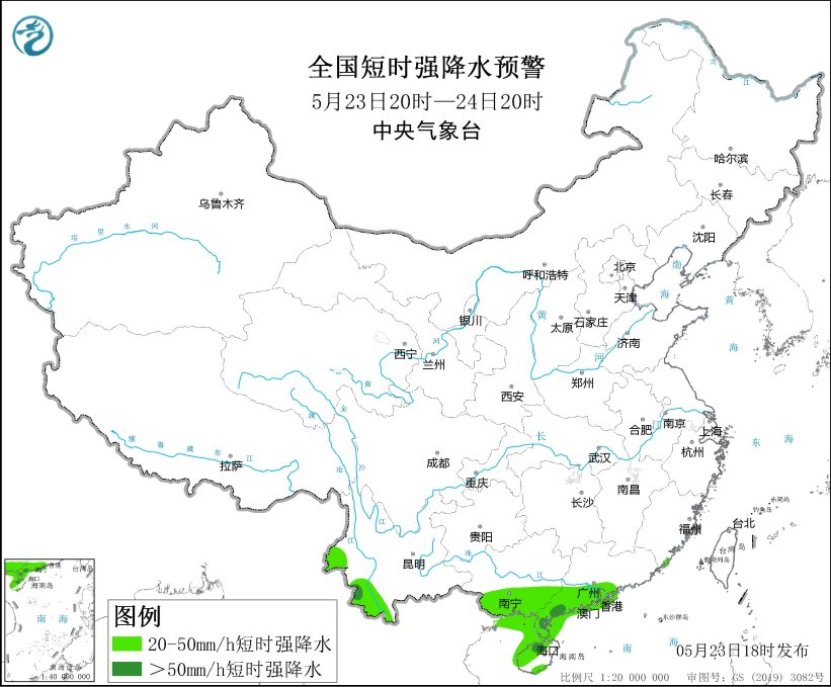23日夜間至24日,雲南、廣西、廣東、海南等地有大到暴雨,局地有大暴雨,並伴有短時強降水、雷暴大風等強對流天氣。預計,5月23日20時至24日20時,雲南西部、廣西中南部、廣東中西部、海南島等地部分地區有大到暴雨,其中,廣東西南部等地局地有大暴雨(100~130毫米)(見圖1)。中央氣象台**5月23日18時繼續發佈暴雨藍色預警。