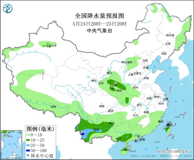 *5月24日20時至25日20時,*西南地區南部、廣西東南部、台灣島大部等地部分地區有中到大雨,其中,雲南西南部、台灣島中北部等地部分地區有暴雨(50~80毫米)。西藏北部部分地區有4~5級風(見圖5)。