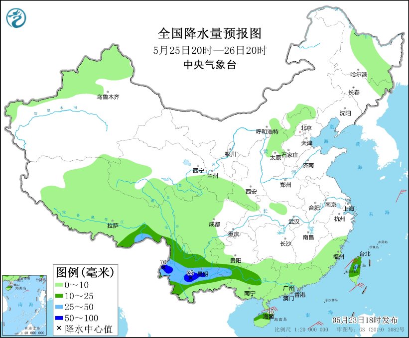 *5月25日20時至26日20時,*西藏東南部、西南地區南部、廣西西北部、台灣島大部等地部分地區有中到大雨,其中,雲南西南部和中部等地部分地區有暴雨(50~85毫米)(見圖6)。