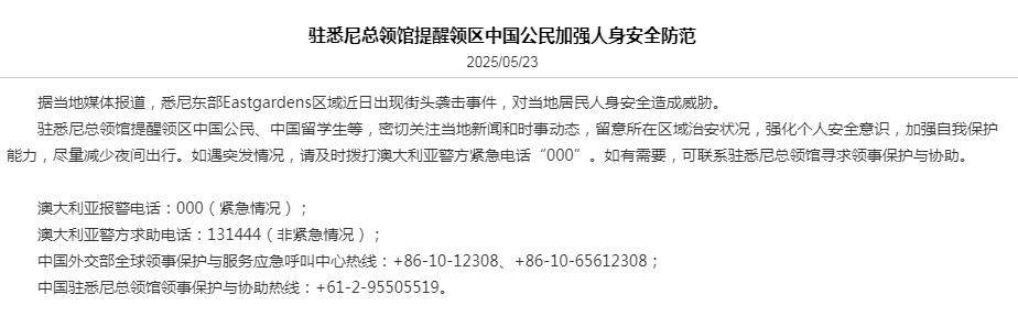 第二條“提醒領區中國公民加強人身安全防範”。該提醒説,據當地媒體報道,悉尼東部Eastgardens區域近日出現街頭襲擊事件,對當地居民人身安全造成威脅。“駐悉尼總領館提醒領區中國公民、中國留學生等,密切關注當地新聞和時事動態,留意所在區域治安狀況,強化個人安全意識,加強自我保護能力,儘量減少夜間出行。如遇突發情況,請及時撥打澳大利亞警方緊急電話‘000’。如有需要,可聯繫駐悉尼總領館尋求領事保護與協助。”