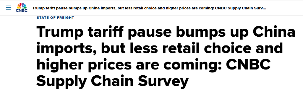 美國消費者新聞與商業頻道近期開展的一項調查顯示,儘管美國政府暫停了針對中國商品徵收的高額關税,其對供應鏈的負面影響依然存在。