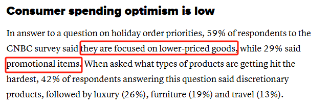 文章認為,這體現了受訪者們對經濟衰退、消費者支出下降的擔憂。而當被問及是否認為消費者支出會下降時,75%的受訪者的回答為“是”,甚至有53%的受訪者認為這種下降已經開始。