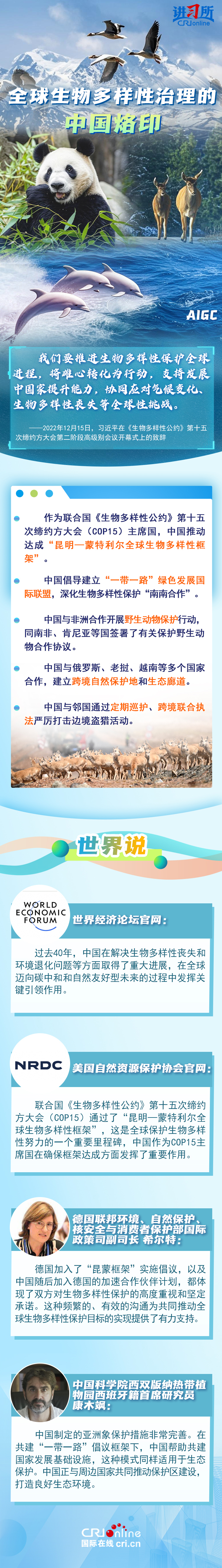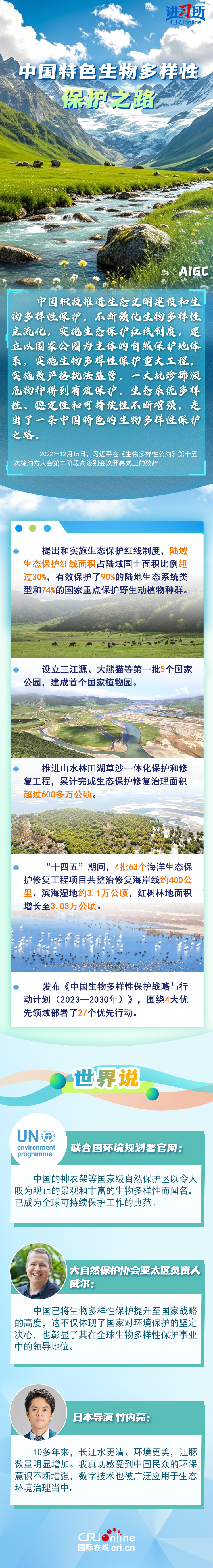 “心往一處想、勁往一處使,共建地球生命共同體。”作為最早簽署、批准《生物多樣性公約》的締約方之一,生物多樣性保護已經上升為中國的國家發展戰略。國際人士表示,中國的一系列舉措體現出對生態環境保護的堅定決心,同時,中國依託共建“一帶一路”倡議等國際合作機制,為推動全球生物多樣性保護提供了有力支持,在邁向自然友好型未來的過程中發揮關鍵的引領作用。
