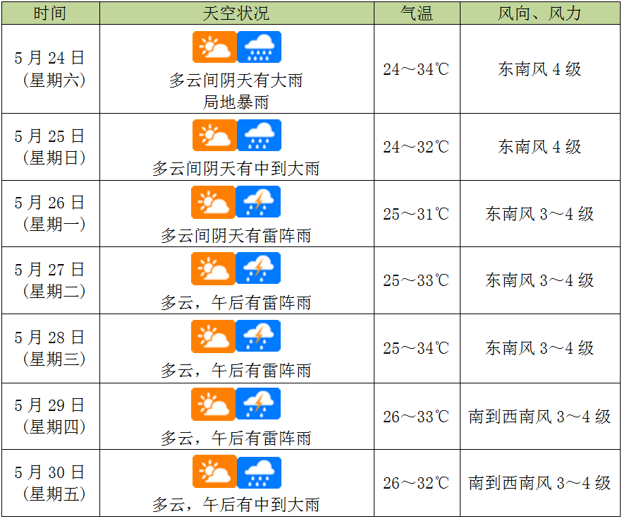 瓊州海峽,5月24日~30日,風力5級、陣風6級,雷雨時陣風7~9級。