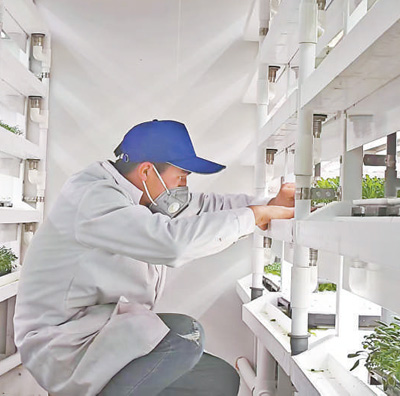 庫車市甬庫同心村智慧農業植物工廠育苗室內,工作人員在仔細觀察幼苗。