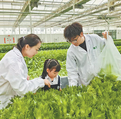 庫車市甬庫同心村智慧農業植物工廠技術員帶領遊客參觀。