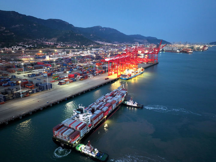 2025年5月2日凌晨,一艘貨輪緩緩停靠江蘇省連雲港港集裝箱碼頭泊位,準備卸運集裝箱(無人機照片)。新華社發(王春攝)