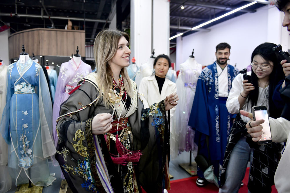 “太有創造力了!”騰龍圖案的漢服令意大利博主卡米拉着迷,“我的社交平台粉絲也都非常喜歡。”第一次穿上漢服,埃及留學生阿卜杜勒·卡里姆興奮地説:“漢服好美,穿上它好像回到古代中國,能感受到中國文化魅力。”