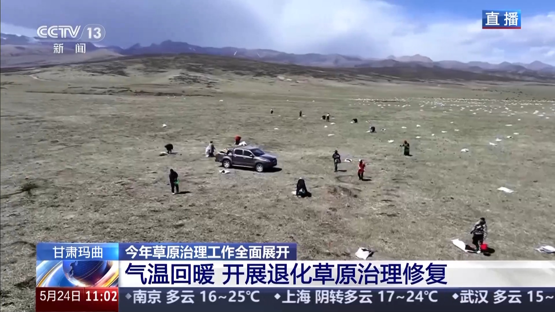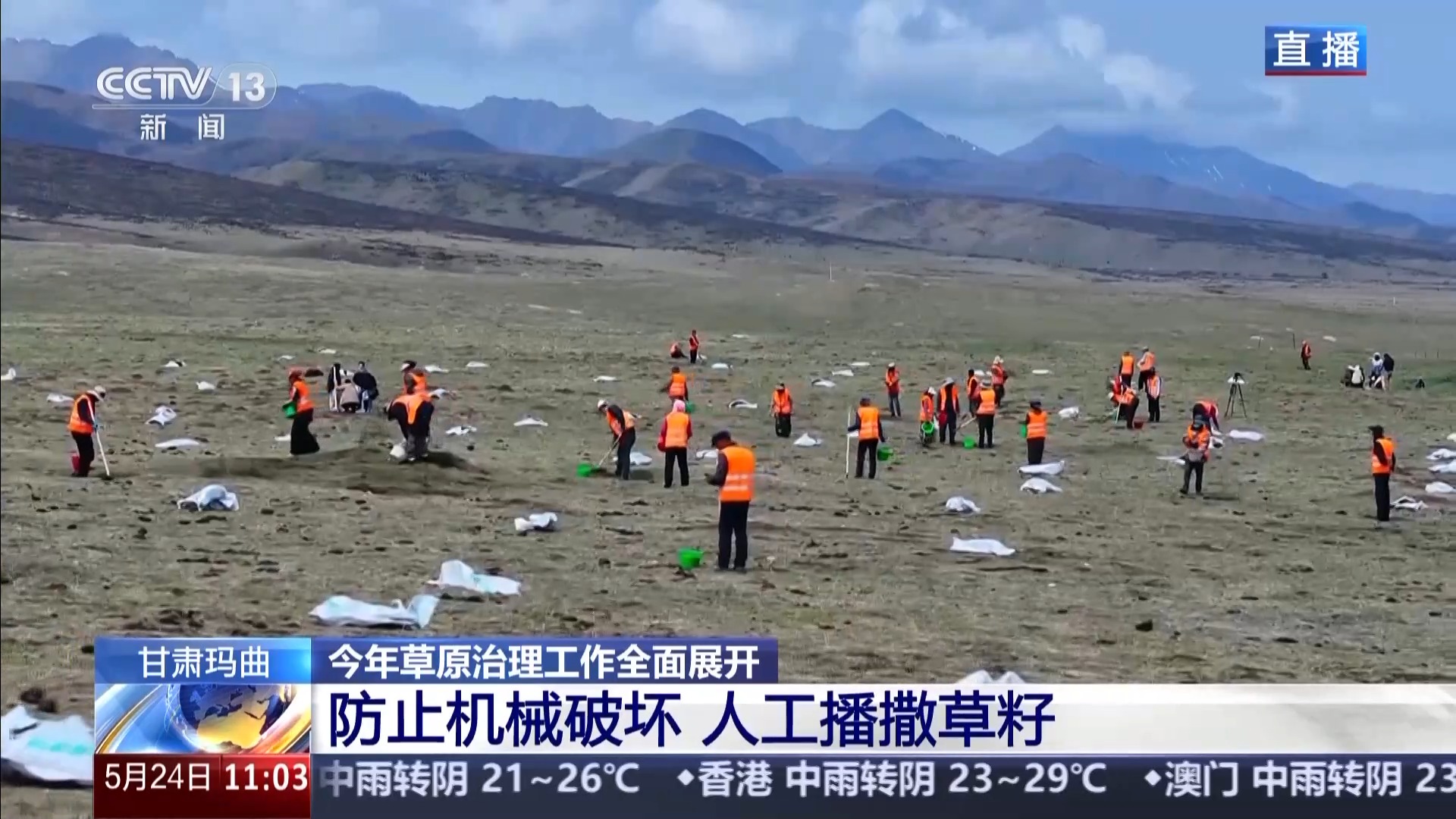 *總枱記者 張磊:*我現在所在的位置是在瑪曲縣歐拉鄉的退化草原治理現場。這裏的海拔達到了3400米,在我身後的山上,依然可以看到白色的積雪。這幾天,當地的氣温逐漸回升,廣袤的草原也開始返青。大家可以看到,我身後的工作人員正在補播牧草。瑪曲縣是一個純牧業縣,天然草原的面積廣闊,佔全縣總面積的83%。但是受氣候變暖等因素的影響,這些草原曾一度面臨着大面積沙化和退化的威脅。從2021年開始,當地實施了山水林田湖草沙一體化保護和修復工程,截至目前,已治理沙化和退化草原63萬畝,大大提升了黃河上游的水源涵養能力。從今年開始,當地還將繼續實施新一輪的草原保護治理工程,治理面積將達到120萬畝。