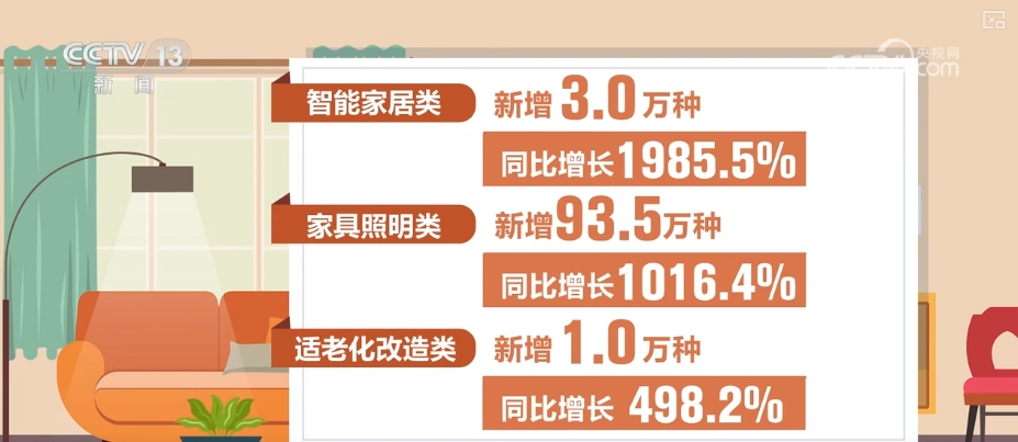 數據顯示,家裝類產品表現突出,裝修材料、衞生潔具、傢俱照明、智能家居、適老化改造5大類消費品新增133.2萬種,同比增長560.8%,涉及企業1.2萬家。