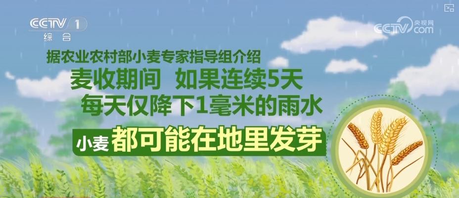 據農業農村部小麥專家指導組介紹,麥收期間,如果連續5天,每天僅降下1毫米的雨水,小麥都可能在地裏發芽。即便是收割上來的小麥,如果沒有及時脱粒,也會在倉庫裏發芽。